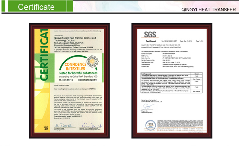Sequenz Wärmeübertragung Aufkleber, Es ist die SGS Umwelt-Zertifikat bestanden und es ist mit guter Wäsche und Farbechtheit. Kann gewaschen werden 40-60 mal, 30 Minuten / Zeit; Es ist elastisch und mit gutem weichem Handgefühl.